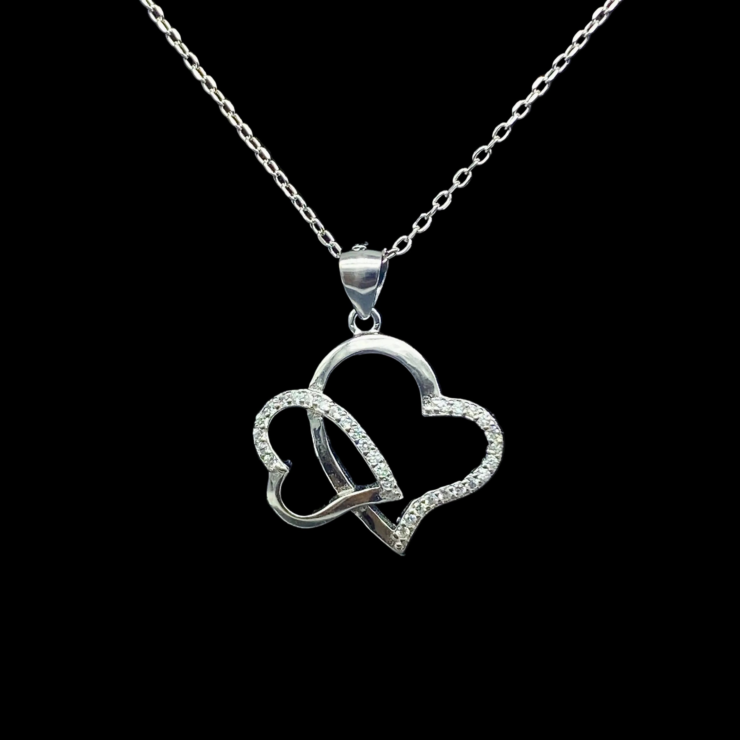 This sterling silver necklace features a modern Double Heart design, with each heart partially adorned with shimmering zircon for a soft, light-catching sparkle. Balanced and refined, the polished silver finish and subtle brilliance create a piece that feels elegant without excess, making it suitable for both everyday wear and special occasions.