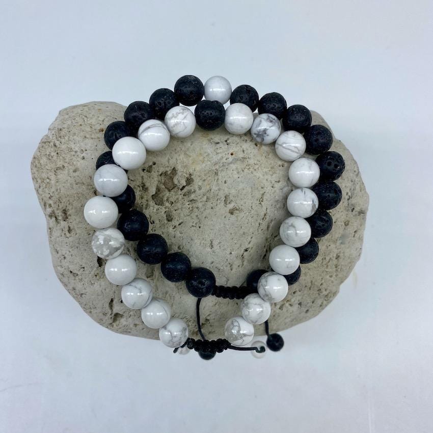 This set consists of 2 beautifully crafted Howlite and Lava Rock Healing Distance Bracelets with adjustable cords.